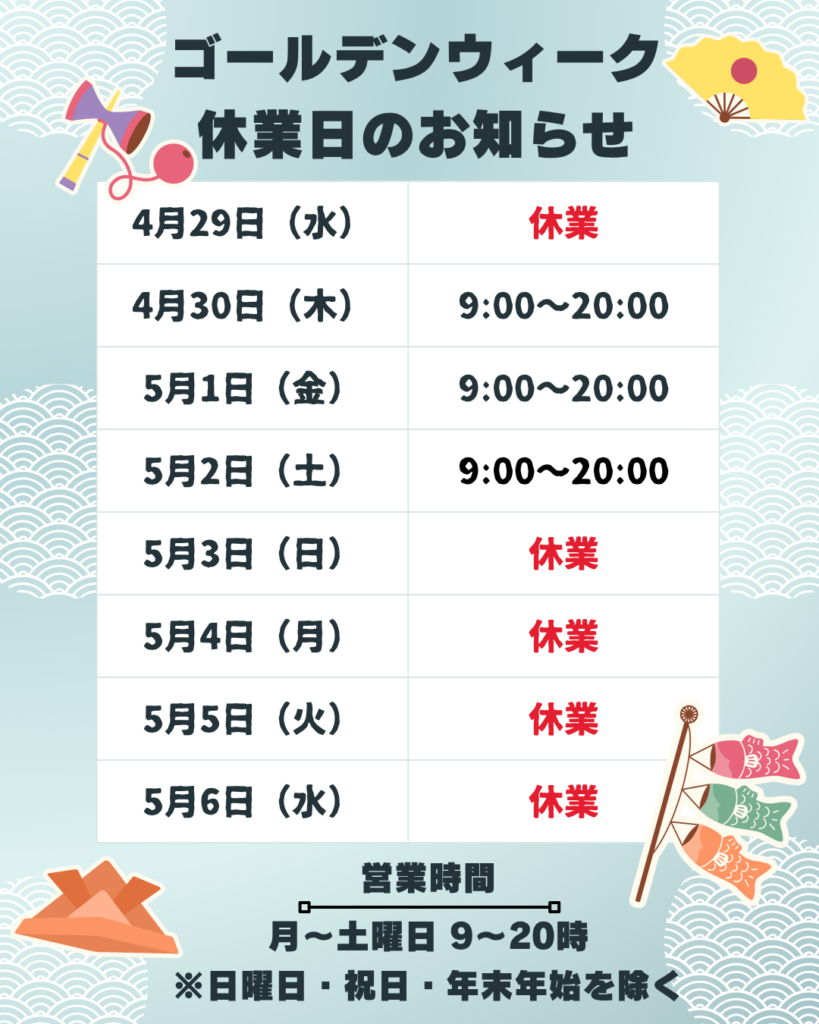 4月29日と5月3日、4日、5日、6日はお休みとなります🙇
