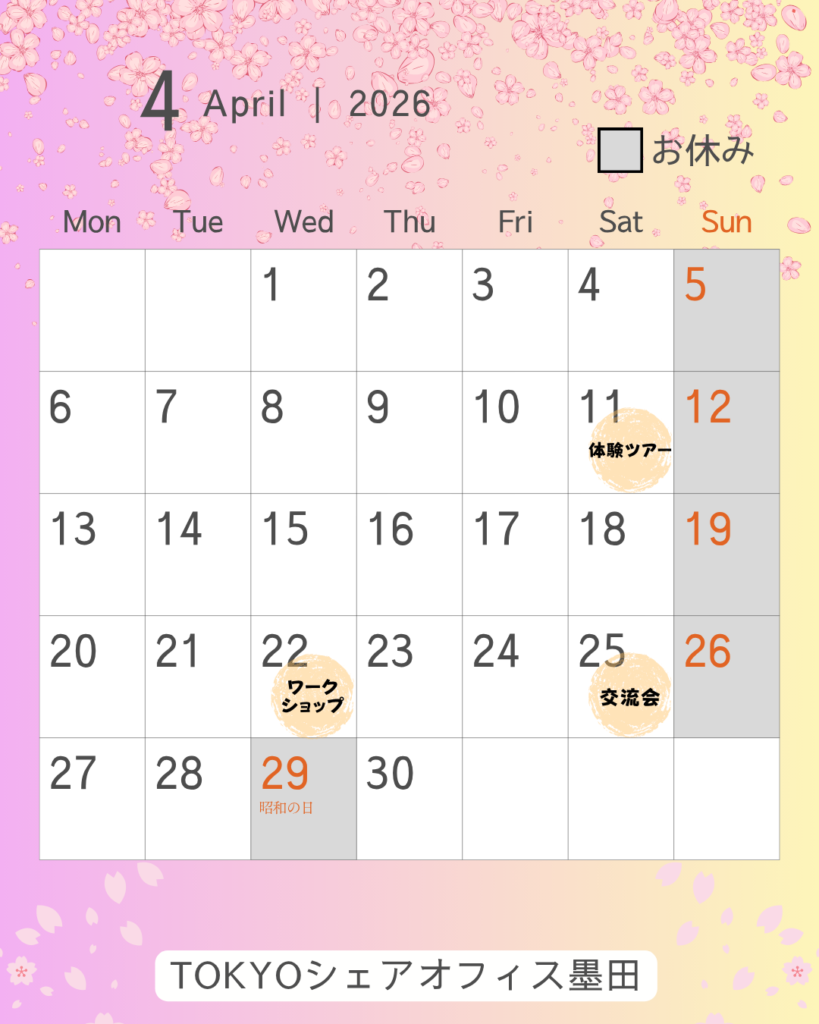 こんにちは😆TOKYOシェアオフィス墨田です!春らしい暖かな天気や可愛らしいお花がたくさん咲いている様子はそれだけでわくわくしてきますね🌸新しい趣味を見つけたり何かに挑戦するのにもピッタリな季節です✨今年度もどうぞよろし...