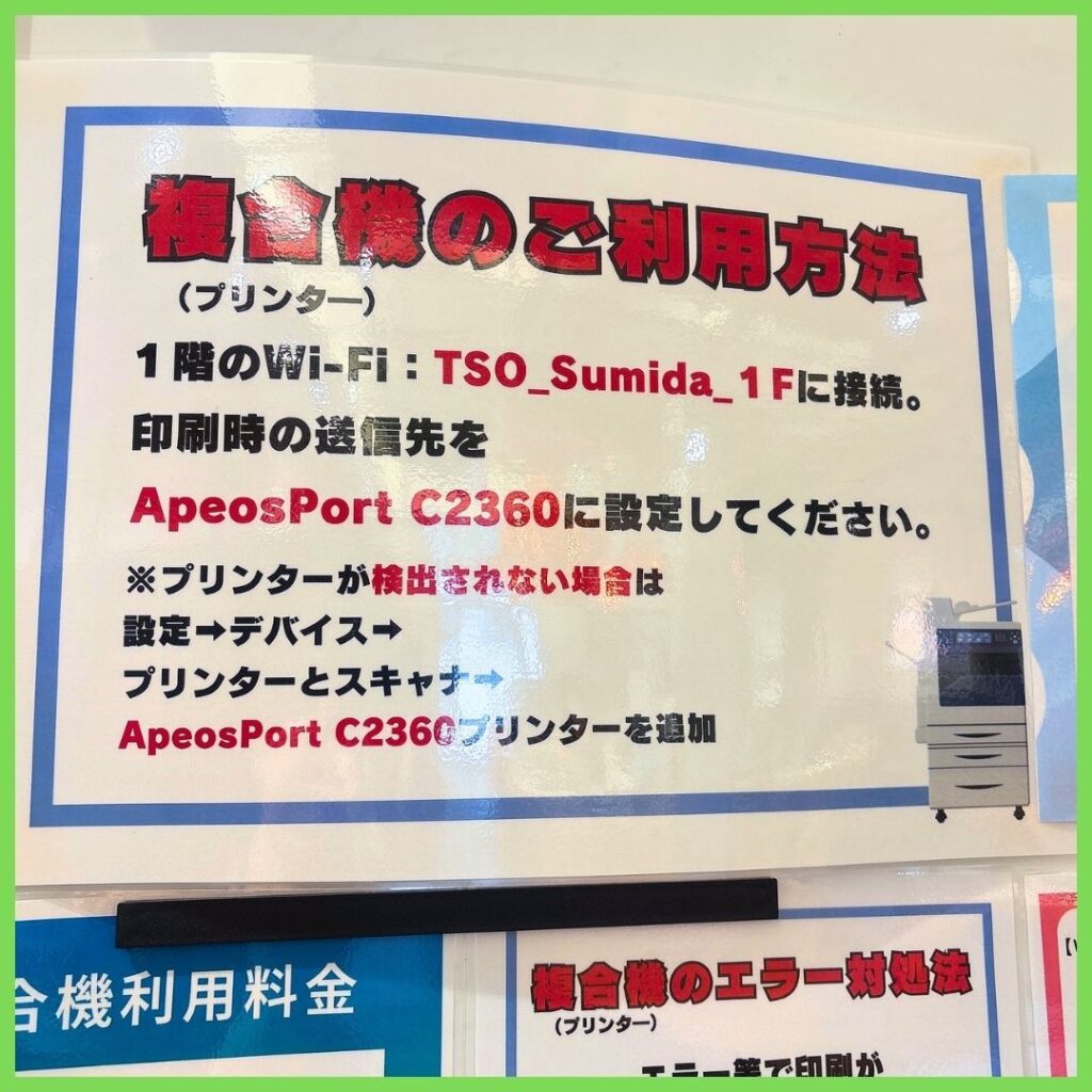 そのため、複合機ご利用の際はTSO墨田の1階のWi-Fiに接続し、送信先をこの複合機に設定してからの印刷をお願いいたします!
