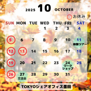 こんにちは!TOKYOシェアオフィス墨田運営スタッフの藤野です。 月が替わり10月となりました!だんだんと気温も涼しくなり、真夏と比べると優しい日差しとなっております。また、秋晴れの日には散歩に出かけたくもなります!もう...
