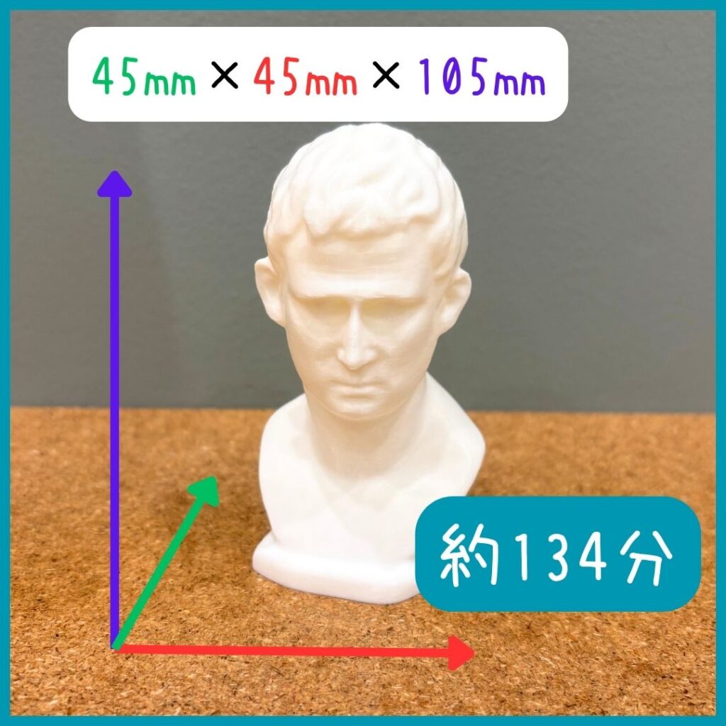 サイズは45mm×45mm×105mm(積層0.08mm)、印刷時間は約134分。