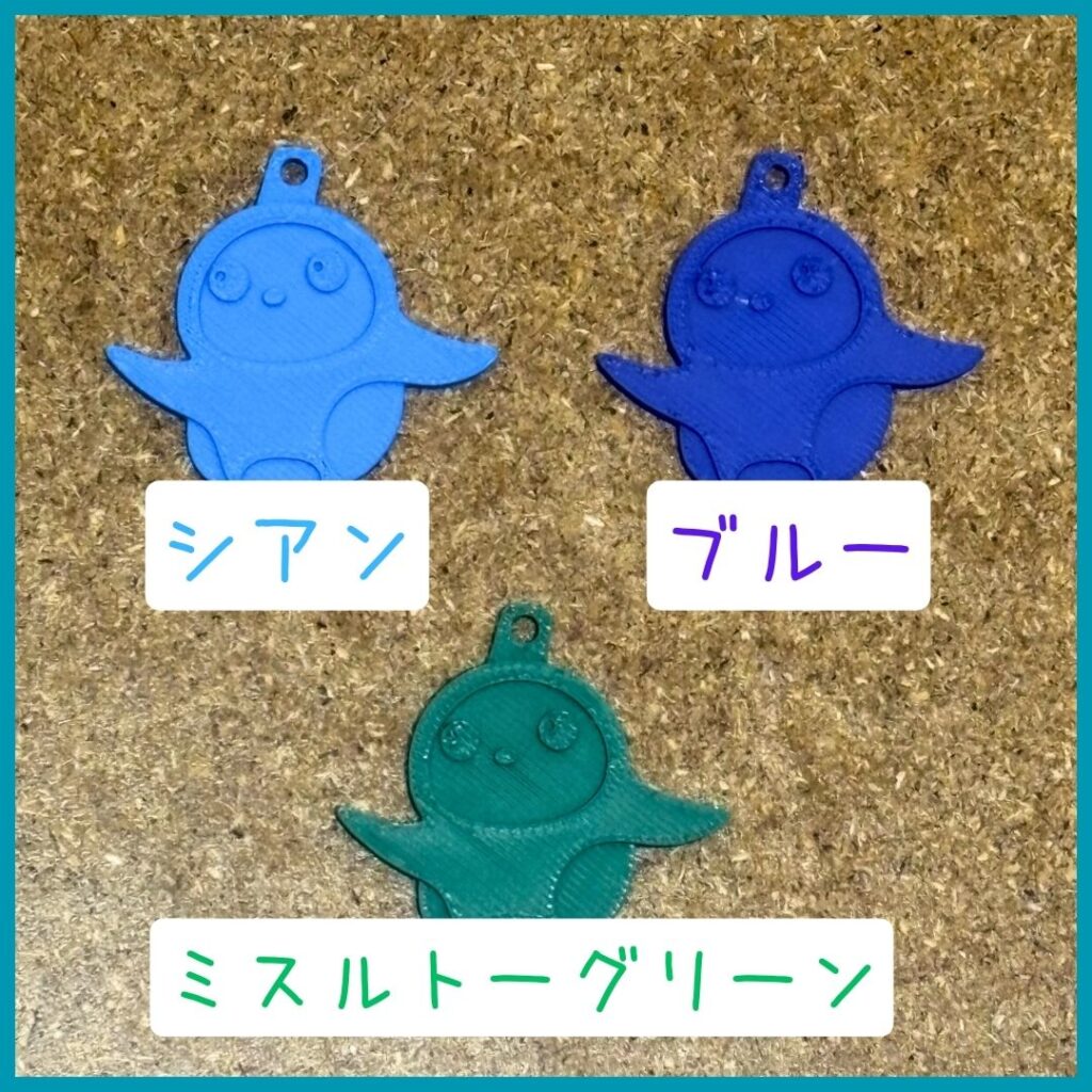 色見本のすみにゃの裏面に貼っているテプラが透けて見えてしまっていますが…それだけきちんと透け感があるという事になります。このフィラメントは個人的にもお気に入りで、キラキラとした造形を作ることができるんです!