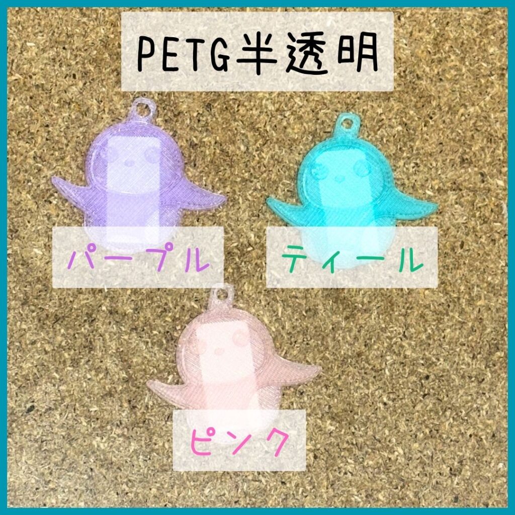 『PETG』は、ペットボトルの素材であるPETを改良した素材で耐衝撃性が高い素材です。また、半透明で光沢のある見た目をしています。
